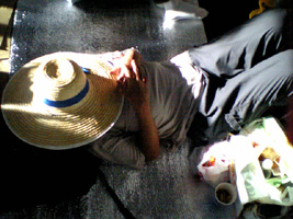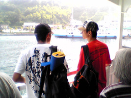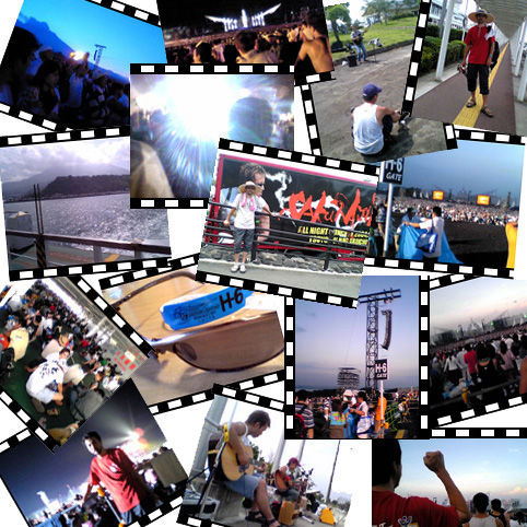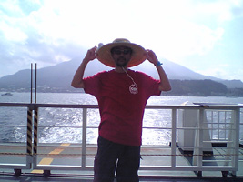 空港〜桜島フェリー ◆エィエィ、ウオーッ!空港からのバスには、サラリーマンに混じってこんな格好をした連中が10名ほどいた。見るからに目的は同じだが、彼らとは年があまりに違いすぎる。 この日のために口髭を生やし、肩にはキティーちゃんタオル。グラサンと麦わら帽子で決めて見せた。まるで、ぐれたカールのおっさん状態である。 さすがに貫禄だけは十分で、若い奴等には負けていない。「エィエィ、ウオーッ!」気合を入れ直して桜島フェリーに乗り込んだ。 左手には、持込み禁止とされているビールが6本、しっかりと握り締められていた。 ◆桜島フェリーにてキップ売り場での混雑を予測し、事前に乗船券を購入していたが、いきなりの裏切りでスイスイと船に・・・。 天気は良かった。しかし、桜島は雲に覆われて姿を現してはくれなかった。「遠くから来たのに、歓迎してくれよ〜」と泣きそうになった。 船内には、長渕Tシャツに身をまとった若者がウジャウジャいて、否が応でも気持ちが高ぶる。つい"桜島"を口ずさんでしまったが、恥ずかしくはなかった。 |