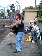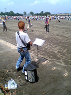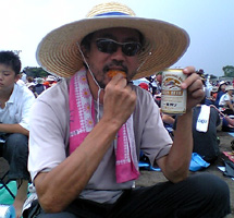 溶岩グラウンド ◆Hブロック10番乗りフェリーを降りると、町営の野球場に誘導された。地元では溶岩グラウンドと呼ばれていて、真っ黒い地面には、AからKまでのブロック名が石灰で書かれてあった。 Hブロックの列に並んだ。前から10番目・・・まあまあじゃん(嬉)。Hブロックは2、3、6、7と4区画あり、約6千人が詰め込まれる予定。 早出した甲斐があったというもの。嬉しさのあまり、Hブロック担当のスタッフと記念撮影。スタッフといってもアルバイトの若いお兄ちゃんである。 このあと、このお兄ちゃんに地獄が待っていようとは・・・この時の二人には知る由もなかった。(怖) ◆ニセ長渕1号〜4号これが噂の、名物”ニセ長渕”たちである。 ニセといっても半端じゃない、どいつもこいつも本気である。ギターにハモニカ、マイクにPAまで・・・「彼ら、桜島に何しに来たんだろう?」と心配すらしてしまう。 小っちゃな女の子の姉妹が、珍しそうに眺めている。「ウチらこれ見に来たん?お母ちゃん」とでも言いたそうな後姿。(傑作の1枚か) とにかく開場までの待ち時間の暇つぶしには持ってこいで、退屈はしなかった。ありがとう、ニセ長渕たち! ☆今夜は最高に盛り上がるぜぃ〜☆ ![]() ![]() ![]() ◆薩摩揚げとビール会場への危険物の持込は、厳しく検査するという。傘は折りたたみ以外はダメ、クーラーボックスも大小を問わずダメ、アルコール類もダメ、あれもダメ、これもダメ。 仕方がないので、空港で買った薩摩揚げをつまみに、隠していたビールを泣く泣く処分することに・・・この日の昼食である。 ところでスタッフにお尋ねしたい。公演終了後に混み合うゲートを自転車を押しながら出て行く客がいたんだけど、”あれはあれでいいのかねえ?”厳しい手荷物検査は何だったの(呆) |
