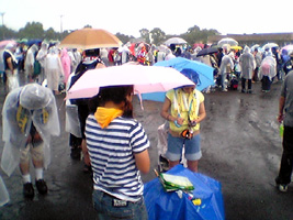 溶岩道路 ◆恐怖の雷雨12時の開場時間が過ぎているのに、溶岩グラウンドから会場への誘導案内が始まらない。少し苛立ち始めた客たちに、雷雨が襲った。 24年前の悪夢が脳裏をよぎった。雷様はあの時ほど近くではなかったが、いくつになっても「へそを隠さねば」と思ってしまう自分が、カワイイ。 雨は30分ほどでやんだが、足元はドロドロ。それでもニセ長渕たちは歌っていた。「彼らって、いったい・・・」 ◆ようやくゲート前夕立が上がった15時、ようやく溶岩道路途中にあるHブロックのゲート前に誘導された。ここで、チケットと引換えにブロック別のリストバンドが手渡される。 左横にはGブロックの客がおとなしく待っている。A〜Dの客を優先に入場させているという情報に、私を含めたHブロックの客たちが怒り始めた。 早朝から待っているのに、今来たAの客たちがスイスイ横を通っている。スタッフの手際の悪さが目立ち、バイトのお兄ちゃんは吊るし上げ状態。 鹿児島始まって以来の7万人イベント。綿密な計画を練っていたに違いないが、手荷物検査に神経を使いすぎてしまい、客の誘導方法はまるで成っていなかった。 長渕は、Captain of the Shipで”お前が舵を取れぃ!”と歌っている。「野外経験豊富な私が舵を取るべきだったのか」と今さらながら腹が立つ。 |