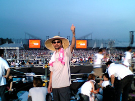 ここが最後の決戦地 ◆H−6ブロック最前列といってもステージからは200mを超える位置。会場は予想以上の広さで、ステージ左右は視野からはみ出すほどの桁外れな長さだ。 会場内をゆっくりと見学したかったが、入場完了が19時すぎで、徹夜に備えての腹ごしらえの準備で精一杯だった。 各ブロックは2本の鉄パイプで囲われ、もたれ掛かっての長時間観戦には強い見方になった。最前列の特権を手にした喜びの瞬間でもある。 ◆会場全体詳細図会場は、ステージ後方に錦江湾と鹿児島市街地が見渡せる。桜島は背中に背負うような格好で配置され、Dブロックあたりから傾斜がついている。 眺めは最高だが、この場所は本来溶岩レキの捨て場になっていたらしく、運が悪いとシートの下はガレキだらけ。とても横になって寝れたもんじゃない。 図の青い線は、剛がオープニングでハーレーに乗って会場入りしたルート。ステージ中央まで一気に駆け上がって来た時には、さすがに度肝を抜かれた。 黄色い線は、真夜中にジープに乗ってセンターステージ(直径6m)にやってきて、再び戻っていったコース。 赤い星印の部分に陣取った訳だが、会場全体の盛り上がった空気を肌で感じられ、センターステージにも近かったということで良としよう。 ◆1m四方の陣地開演の21時が回っているのに、まだお客が入場している。今のうちにと、横になり下半身は鉄パイプにかけたままでの仮眠をとる。 昼の雷雨の時に役立った麦わら帽が、夜はアイマスクになり重宝した。地面は溶岩レキが平気でゴロゴロしていて、厚手の敷きマットも正解だった。 結局、19時から予定されていた地元の歓迎セレモニーは中止となった。 ◆会場最後列から第2部開演前、トイレ休憩と腹ごしらえにビールを買いに行った。「な、な、なんとノンアルコールビールではないか!」やはり23時を回ると法的な販売規制がかかってしまうのか。昔の野外はフリーで、私のような酔っぱらいのヘベレケおやじがたくさんいたのに。 でもいいか、夜明けの乾杯用に持込みビールを1本とってあるし・・・ 会場内でもニセ長渕を発見!「もう〜エエやろ!」と呆れて笑いが止まらなかった。 ◆剛、最接近!会場の地図が公表され、「Gブロック中央の四角いマスは、後方の客用センターステージ」という噂で持ちきりだった。もしそうだったらこの位置からだと目と鼻の先、生剛を拝めることになる。 期待は裏切られなかった。第2部の途中、メインステージからジープに乗ってやって来た。6mの円形ステージで、剛が乗っかると2mほどせり上がり、この上で5曲ほどやってくれた。 チューニングの時、「何を歌おうかな〜」って言うから、私が「巡恋歌ァ〜!」と数回叫ぶと、これまた嘘のように巡恋歌が始まったではないか。後方の客たちは、大盛り上がりである。 私的には、巡恋歌のギターとハモニカの生テクニックを間近で見られ、「Aブロックに勝った、9500円の元は取れた」と一人で納得し、”いつかの少年”に涙していた。 ◆拳と声帯アルコールが両肩の潤滑油となり、朝まで支障なく拳を突き上げることが出来た。もちろん片方の手は、ブロック仕切り用の鉄パイプをしっかり握り締め、腰への負担を最小限に留めている。 剛は「ヘイ!」と「ウォー!」が大好きで、朝まで何百回叫ばされただろうか・・・。歌を少しやっているのでノドには自身があったが、夜通しの歌いっ放しは声帯を痛めつけるには十分すぎた。 終演後の声は、まるで壊れたラジオの雑音のようで、ある意味渋チンなシワ枯れ声になっていた。”親父のセイヤ!"の録音用に取っておきたかった。 ◆感動の夜明け14年ぶり、10回目の感動の夜明けである。昨日は雲でかすんで歓迎してくれなかった桜島が、「よう〜こそ〜」と、くっきり姿を現した。 剛の「夜明けダァ!」の声に7万5千人が一斉に後ろを振り返り、ボルテージも最高潮に達する。 何度味わってもいい・・・ 熱いものが身体の芯から込み上げてくる瞬間である。 |