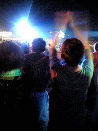 完全燃唱の朝 ◆右腕はまだ上る、イエィ!3枚目のガッツポーズだが、疲れのせいか微妙に角度が甘くなっている。 一仕事終えた後のビールの味は最高だった。(持込み禁止の最後の1本を、会場で買ったカチ割氷で密かに冷やしておいた、へへへ) コンサートの余韻に浸っているのに、周りはそそくさと退場の準備を始めている。早くしないと、フェリー乗り場までの3kmを、牛のようにノロノロと歩かされるからだ。 会場内や溶岩道路の道端には、疲れきった連中がゴミのように転がっていた。戦闘服こそ着てはいないが、まるで悲惨な戦場の跡のようである。 救護班のおじちゃん達がボヤいていた。 「この人たち、眠ってんだか具合が悪くて倒れてんだか、判別に困るでごわすぅ〜」 ・・・・まさしくその通りである(爆笑) ◆センターステージ帰り際に近くまで行ってみた。意外と狭く、「こいつが2mもせり上がったのか〜」と田舎もん丸出しで感動した。 不思議なことが一つある。夜中に、ここまでジープを走らせ戻っていった・・・前方付近は、ブロック内に入れない客達で通路が塞がれていたはず。 「通路一杯の客達を、いつの間に排除したんだろ?ジープを避け切れなかった客の何人かは、きっと足のつま先にタイヤが乗っかったに違いない!」 と、今でも信じられない。 ◆役に立ったのか?・溶岩専用サンダル ・・・○ やはり会場内の至る所に溶岩レキがゴロゴロしていた。夕立のあとの速乾性能にも優れ正解だった。 ・ミニ双眼鏡 ・・・○ 映像ビジョンがあったが、やはり生の剛を確認するにはこれしかない。欠点は、覗いている間はノリノリを中断しなければならなかったこと。 ・麦わら帽子 ・・・◎ 本来の日除け機能に加え、夕立時の傘、仮眠用アイマスク&枕、うちわ、足元小物入れと、一石6鳥の働きをしてくれた。 ・敷きマット ・・・◎ 地面状態は想像以上の悪さで、こいつが無かったら横になっての仮眠は望めなかった。 ・折りたたみ椅子 ・・・△ 長〜い待ち時間に使用しただけで、会場では不要だった。なぜって、演奏中は朝まで立ちっ放し! ◆Sakurajima、最高!昨日の会場入りまでの待ち時間が嘘のように、すんなりとフェリーに乗船。桜島もしっかりと姿を現し、7万5千人を見送ってくれた。最初で最後になるかもしれない鹿児島の旅で、最高の思い出を刻むことが出来た。 徹夜の野外LIVE、音の楽しみ方の一つには違いない。長渕の歌は、鼓膜以外の全身の穴から遠慮なく進入してきた。 ・・・・・ |