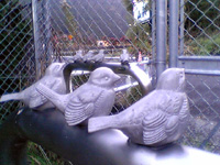 お洒落な立入り防止柵 亜鉛メッキされた金網の中の ステンレスの止まり木に 銀メッキされた雀たち 今にも飛び出しそうな格好だが なぜか寂しそうな目をしている |